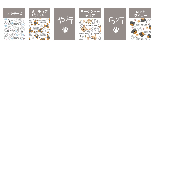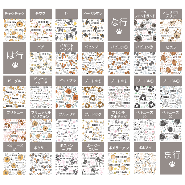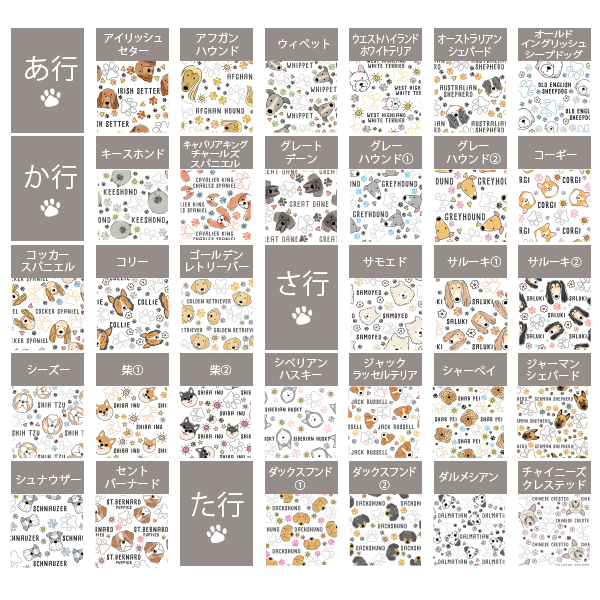 アイリッシュセター、アイリッシュセッター、アフガンハウンド、ウエストハイランドホワイトテリア、ウェストハイランドホワイトテリア、ウェスティ、ウエスティ、ウィペット、ウイペット、オーストラリアンシェパード、オーシェパ、オールドイングリッシュシープドッグ、オーシー、キースホンド、キャバリアキングチャールズスパニエル、グレートデーン、グレートデン、グレーハウンド、ウェルシュコーギー、アメリカンコッカースパニエル、コリー、ゴールデンレトリーバー、サモエド、サルーキ、シーズー、柴、しば、シベリアンハスキー、ジャックラッセルテリア、シャーペイ、ジャーマンシェパード、シュナウザー、セントバーナード、ダックスフンド、ダルメシアン、チャイニーズクレステッド、チャイクレ、チャウチャウ、チワワ、狆、ちん、ドーベルマン、ニューファンドランド、ノーリッチテリア、パグ、バセットハウンド、バセンジー、パピヨン、ハンガリアンビズラ、ビーグル、ビションフリーゼ、ピットブル、プードル、スタンプー、ブリタニースパニエル、ブリュッセルグリフォン、ブルテリア、ブルドッグ、フレンチブルドッグ、フレブル、ペキニーズ、ボクサー、ボストンテリア、ボーダーコリー、ポメラニアン、ボルゾイ、マルチーズ、ミニチュアピンシャー、ミニピン、ヨークシャーテリア、ヨーキー、ロットワイラー