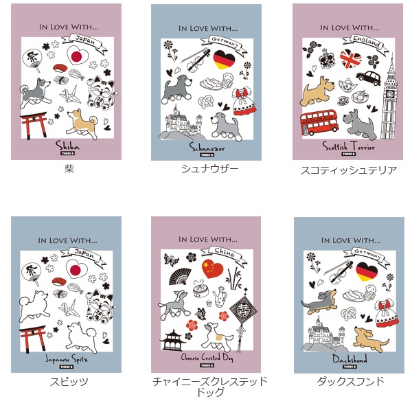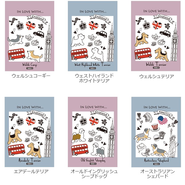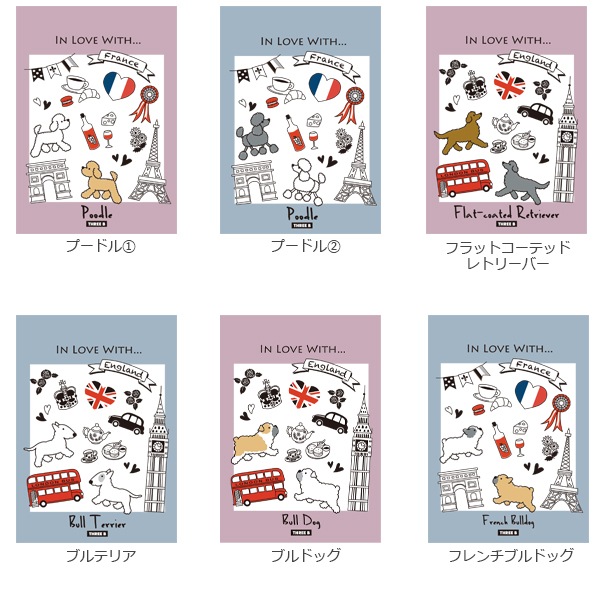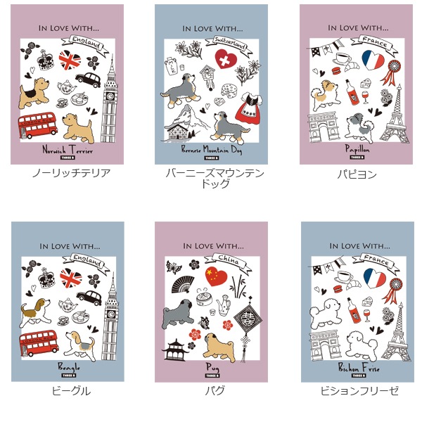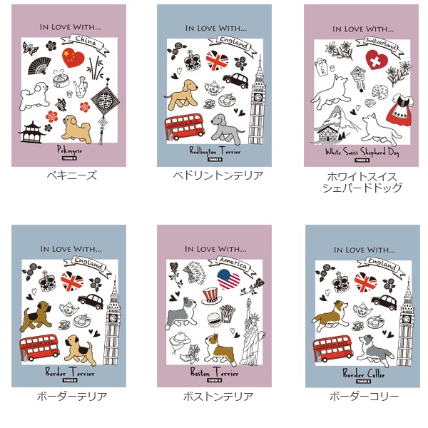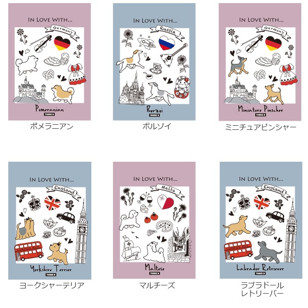 犬種の原産国をモチーフに、色はピンクとブルーの2色。中の絵柄も交互に無地と罫線でデザインが変わるので楽しみながら使えます!
