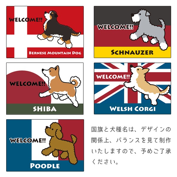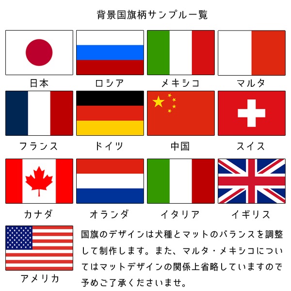 | ご注意 | ・モニター発色の具合により色合いが異なる場合がございます。 国旗のデザインと犬種のデザインのバランスを調整して制作いたします。また、マルタ・メキシコについてはマットデザインの関係上省略していますので、予めご了承くださいませ。 |
