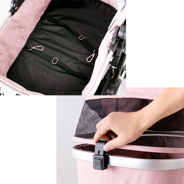 コット内にはワンちゃんの飛び出し防止にフックが2本標準装備♪