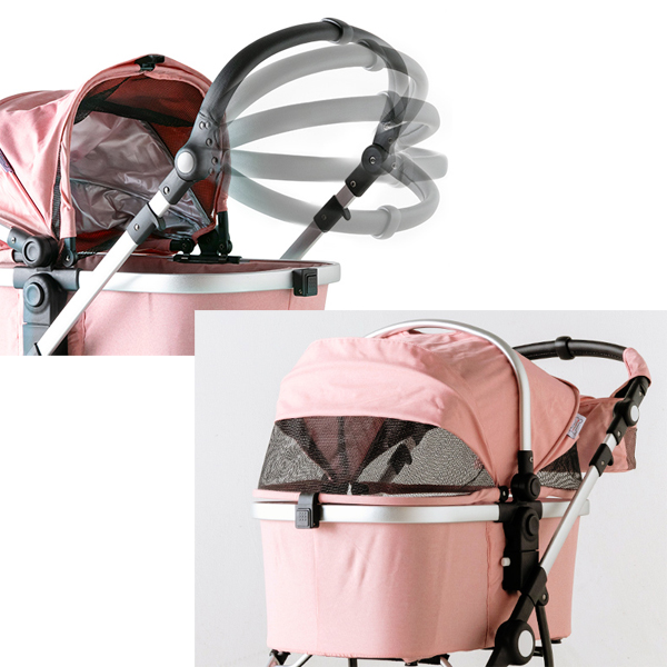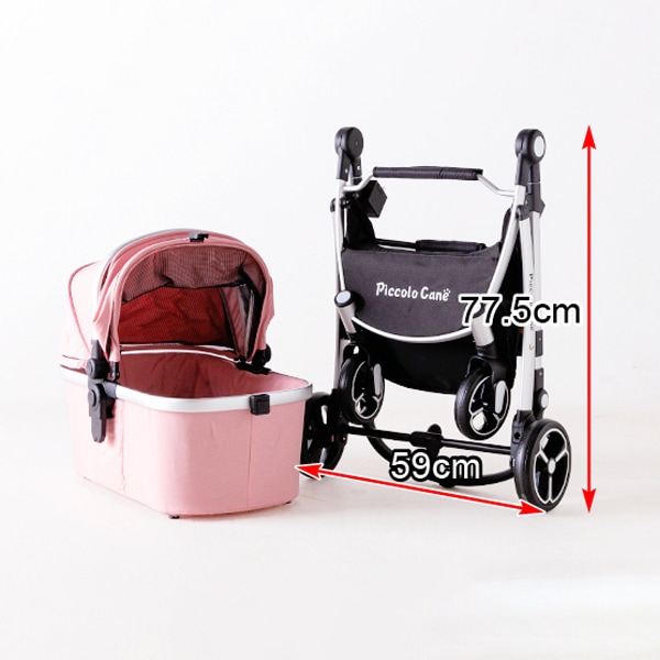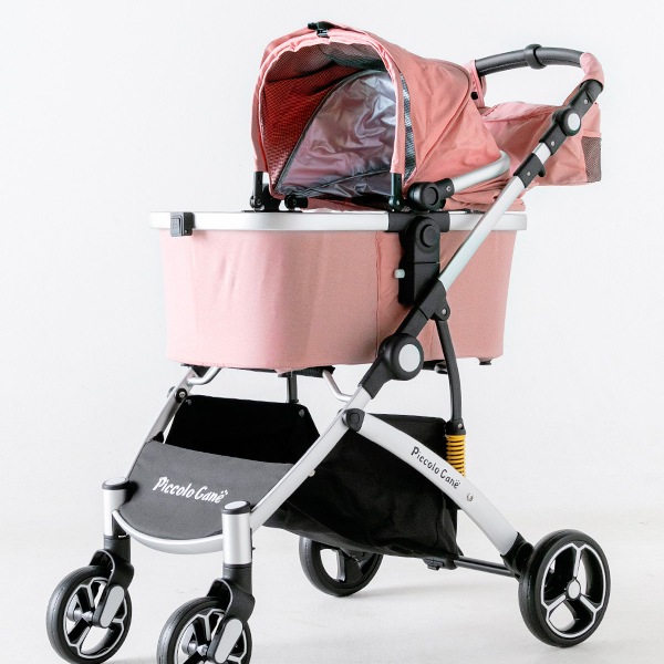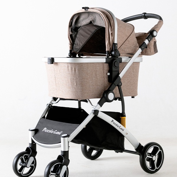 小型犬におすすめのサイズ感と、女性でも押しやすい軽快な操作性はそのままに、キャリーコットのセパレート構造、段差の衝撃をやわらかく吸収するサスペンション、5段階調節可能なハンドルなど、快適装備も充実。
