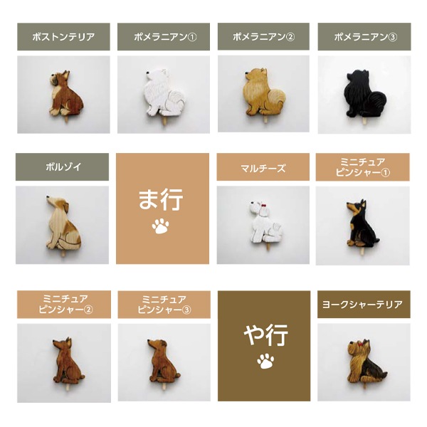 アイリッシュセター、秋田、アフガンハウンド、アメコカ、イタリアングレーハウンド、イングリッシュコッカースパニエル、ウェルシュテリア、エアデールテリア、オーストラリアンシェパード、キャバリア、グレートデーン、グレートピレニーズ、ケアーンテリア、ウェルシュコーギー、シーズー、シェパード、シェルティ、柴、ジャックラッセルテリア、シュナウザー、セントバーナード、ダックスフンド、チャウチャウ、チワワ、トイプードル、ドーベルマン、ニューファンドランド、ノーフォークテリア、ノーリッチテリア、バーニーズ、パグ、ハスキー、バセットハウンド、バセンジー、パピヨン、ビーグル、プードル、フラットコーテッドレトリーバー、ブルドッグ、フレンチブルドッグ、ペキニーズ、ボーダーコリー、ボストンテリア、ポメラニアン、ボルゾイ、マルチーズ、ミニチュアピンシャー、ヨークシャーテリア、ラフコリー、ラブラドールレトリーバー、レオンベルガー、ワイアーフォックステリア
