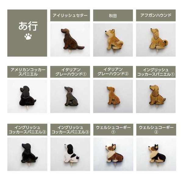 アイリッシュセター、秋田、アフガンハウンド、アメコカ、イタリアングレーハウンド、イングリッシュコッカースパニエル、ウェルシュテリア、エアデールテリア、オーストラリアンシェパード、キャバリア、グレートデーン、グレートピレニーズ、ケアーンテリア、ウェルシュコーギー、シーズー、シェパード、シェルティ、柴、ジャックラッセルテリア、シュナウザー、セントバーナード、ダックスフンド、チャウチャウ、チワワ、トイプードル、ドーベルマン、ニューファンドランド、ノーフォークテリア、ノーリッチテリア、バーニーズ、パグ、ハスキー、バセットハウンド、バセンジー、パピヨン、ビーグル、プードル、フラットコーテッドレトリーバー、ブルドッグ、フレンチブルドッグ、ペキニーズ、ボーダーコリー、ボストンテリア、ポメラニアン、ボルゾイ、マルチーズ、ミニチュアピンシャー、ヨークシャーテリア、ラフコリー、ラブラドールレトリーバー、レオンベルガー、ワイアーフォックステリア