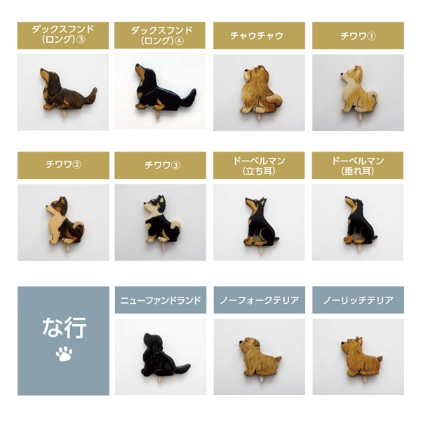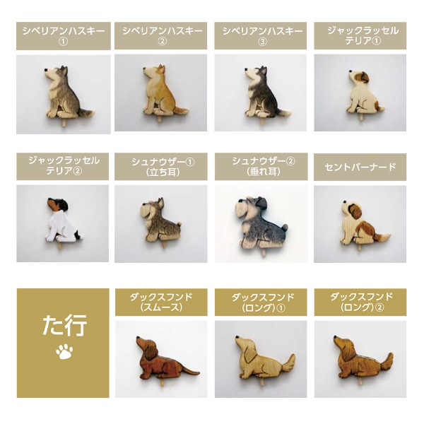 アイリッシュセター、秋田、アフガンハウンド、アメコカ、イタリアングレーハウンド、イングリッシュコッカースパニエル、ウェルシュテリア、エアデールテリア、オーストラリアンシェパード、キャバリア、グレートデーン、グレートピレニーズ、ケアーンテリア、ウェルシュコーギー、シーズー、シェパード、シェルティ、柴、ジャックラッセルテリア、シュナウザー、セントバーナード、ダックスフンド、チャウチャウ、チワワ、トイプードル、ドーベルマン、ニューファンドランド、ノーフォークテリア、ノーリッチテリア、バーニーズ、パグ、ハスキー、バセットハウンド、バセンジー、パピヨン、ビーグル、プードル、フラットコーテッドレトリーバー、ブルドッグ、フレンチブルドッグ、ペキニーズ、ボーダーコリー、ボストンテリア、ポメラニアン、ボルゾイ、マルチーズ、ミニチュアピンシャー、ヨークシャーテリア、ラフコリー、ラブラドールレトリーバー、レオンベルガー、ワイアーフォックステリア