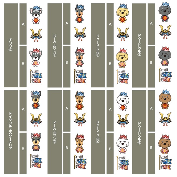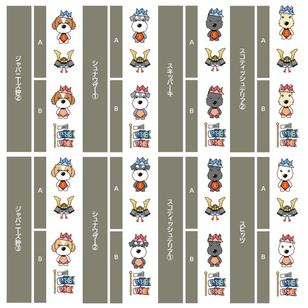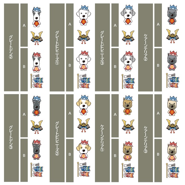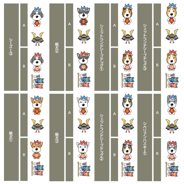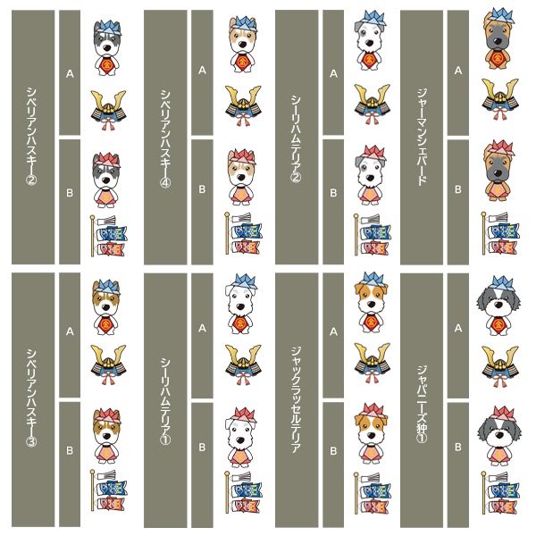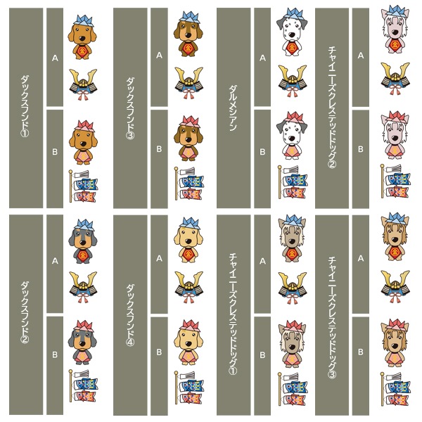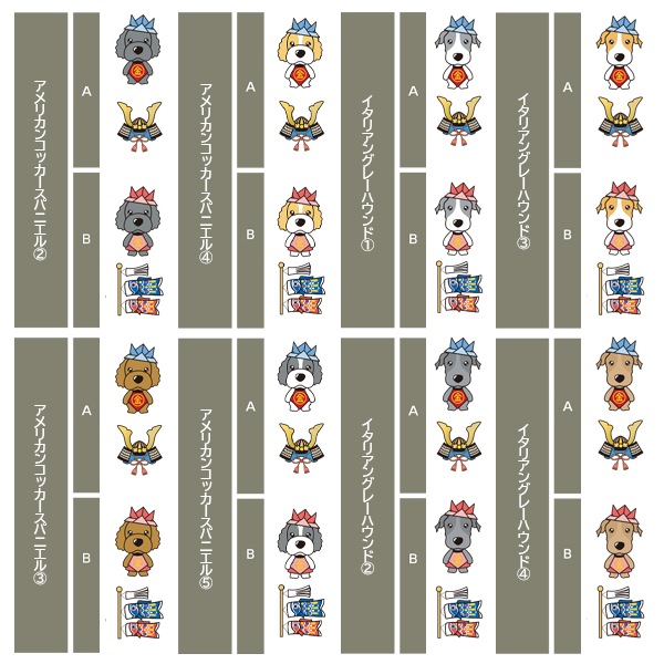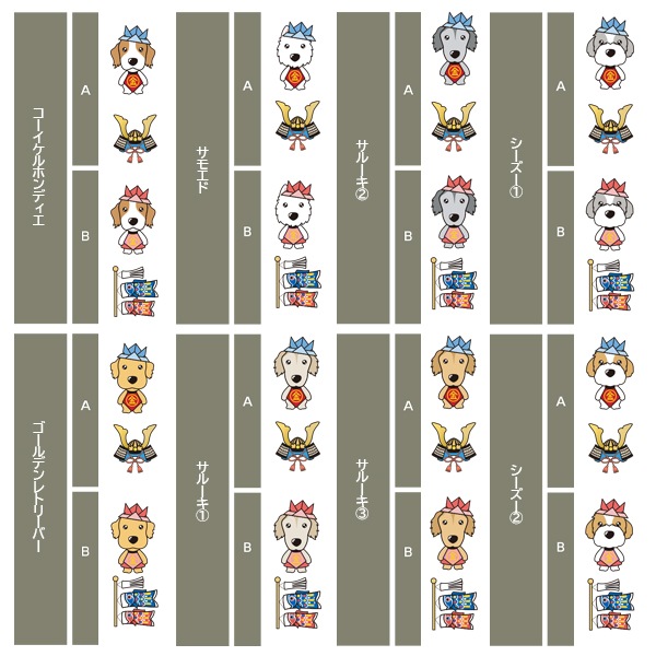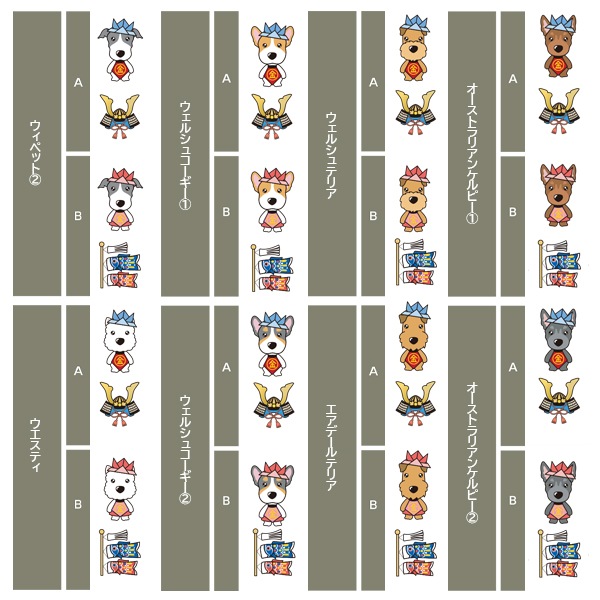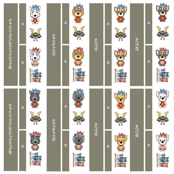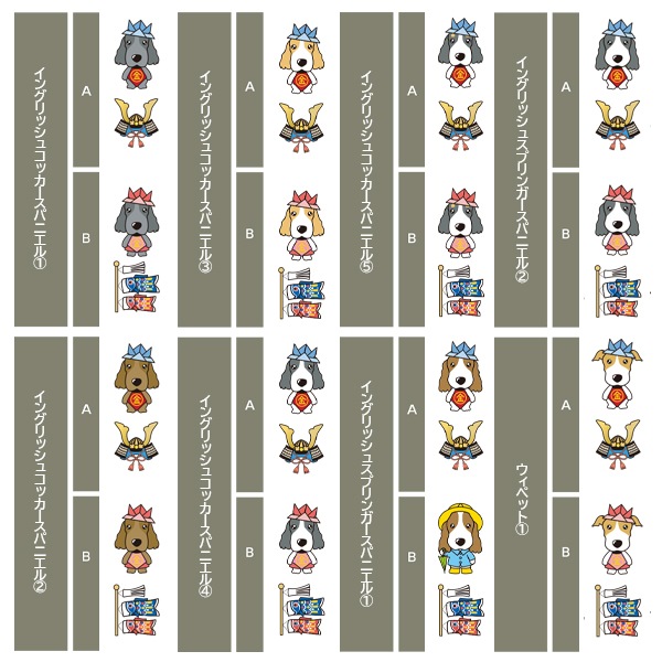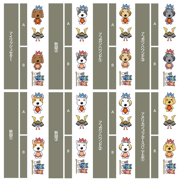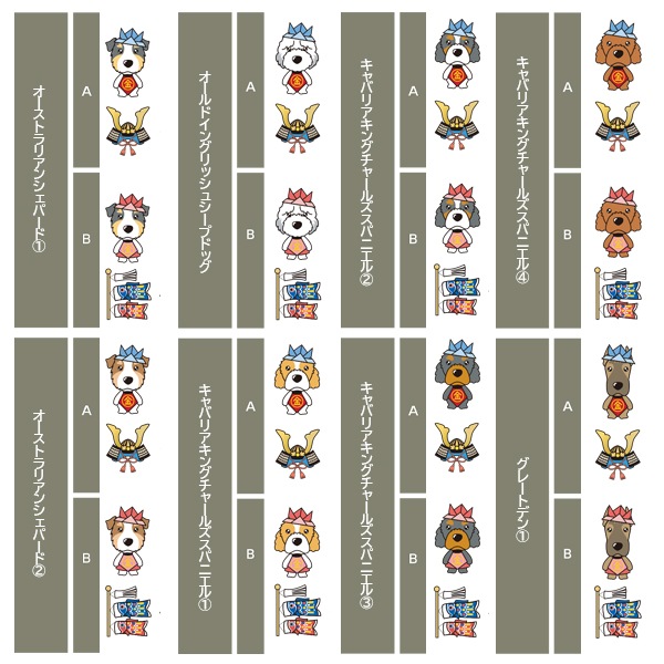 アイリッシュセター、秋田、アフガンハウンド、アメコカ、イタリアングレーハウンド、イングリッシュコッカースパニエル、イングリッシュスプリンガースパニエル、ウィペット、ウエスティ、ウェルシュコーギー、ウェルシュテリア、エアデールテリア、オーストラリアンケルピー、オーストラリナンシェパード、オールドイングリッシュシープドッグ、キャバリア、グレートデン、グレートピレニーズ、ケアーンテリア、コーイケルホンディエ、ゴールデンレトリーバー、サモエド、サルーキ、シーズー、柴、シェットランドシープドッグ、シベリアンハスキー、シーリハムテリア、ジャックラッセルテリア、ジャーマンシェパードドッグ、シュナウザー、スキッパーキ、スコティッシュテリア、スピッツ、ダックスフンド、ダルメシアン、チャイニーズクレステッドドッグ、チャウチャウ、チワワ、狆、トイマンチェスターテリア