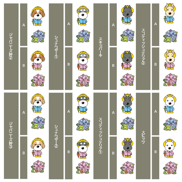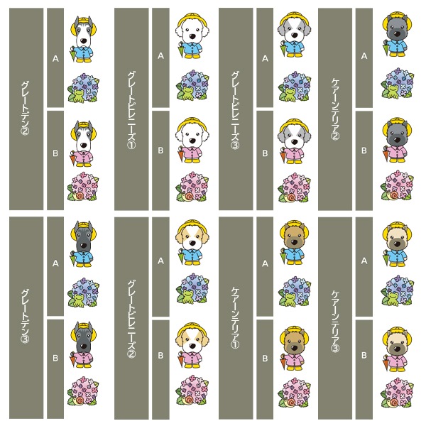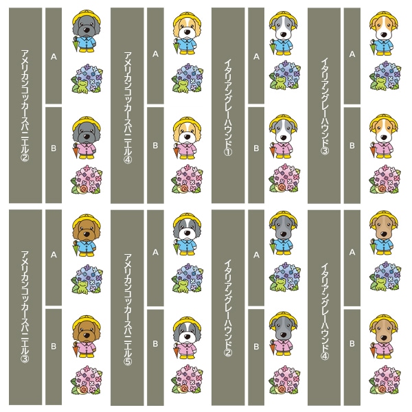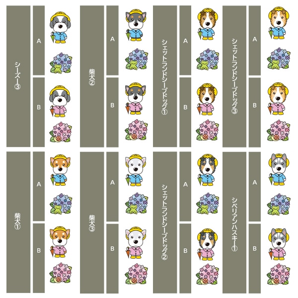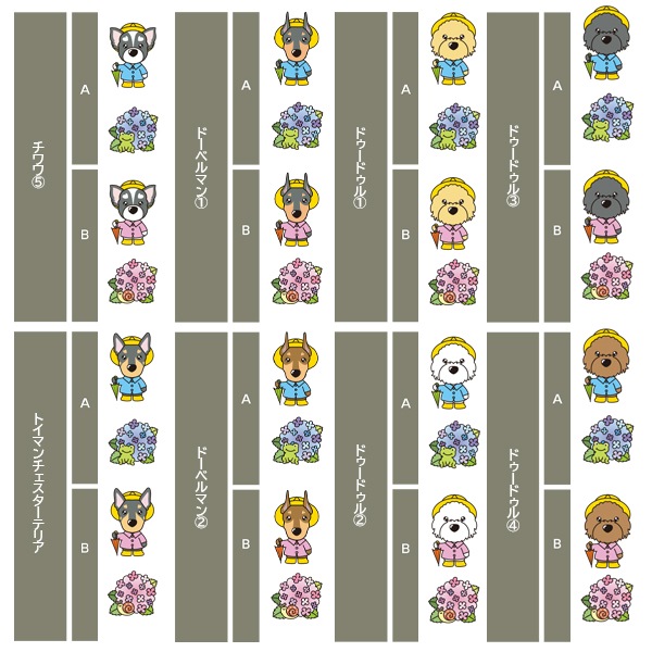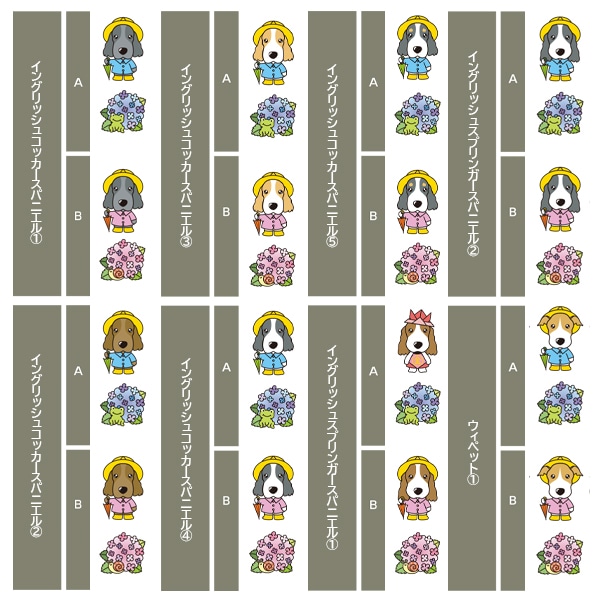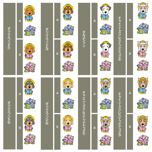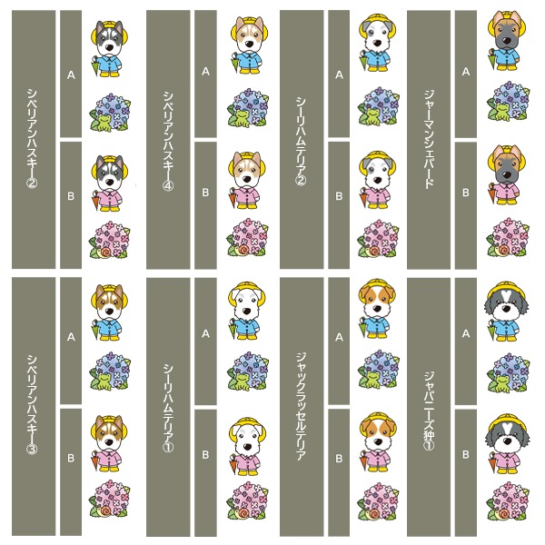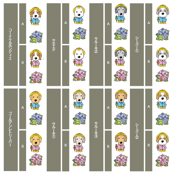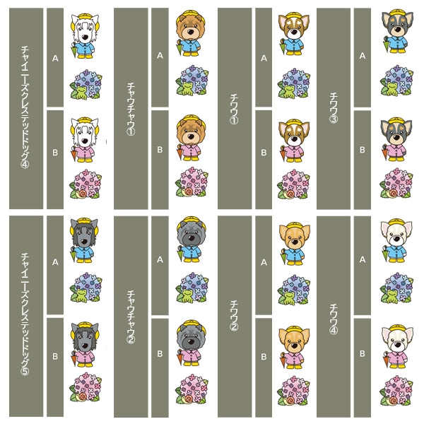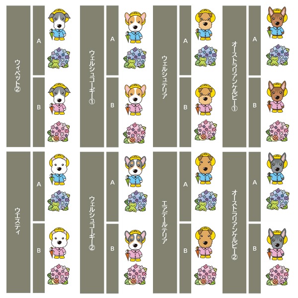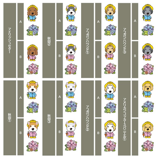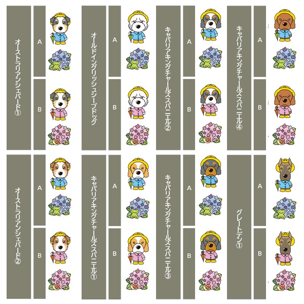 アイリッシュセター、秋田、アフガンハウンド、アメコカ、イタリアングレーハウンド、イングリッシュコッカースパニエル、イングリッシュスプリンガースパニエル、ウィペット、ウエスティ、ウェルシュコーギー、ウェルシュテリア、エアデールテリア、オーストラリアンケルピー、オーストラリナンシェパード、オールドイングリッシュシープドッグ、キャバリア、グレートデン、グレートピレニーズ、ケアーンテリア、コーイケルホンディエ、ゴールデンレトリーバー、サモエド、サルーキ、シーズー、柴、シェットランドシープドッグ、シベリアンハスキー、シーリハムテリア、ジャックラッセルテリア、ジャーマンシェパードドッグ、シュナウザー、スキッパーキ、スコティッシュテリア、スピッツ、ダックスフンド、ダルメシアン、チャイニーズクレステッドドッグ、チャウチャウ、チワワ、狆、トイマンチェスターテリア