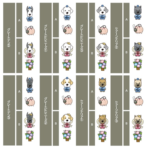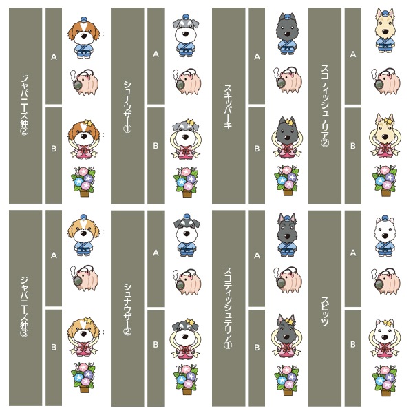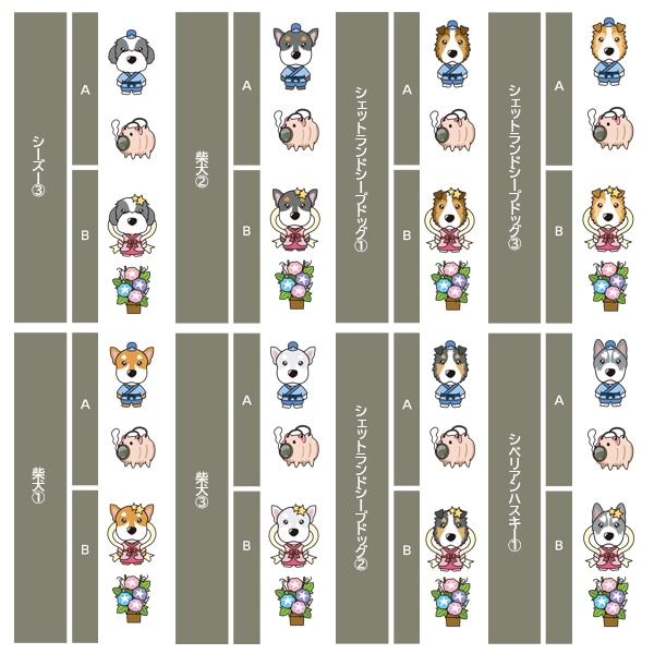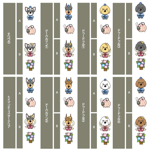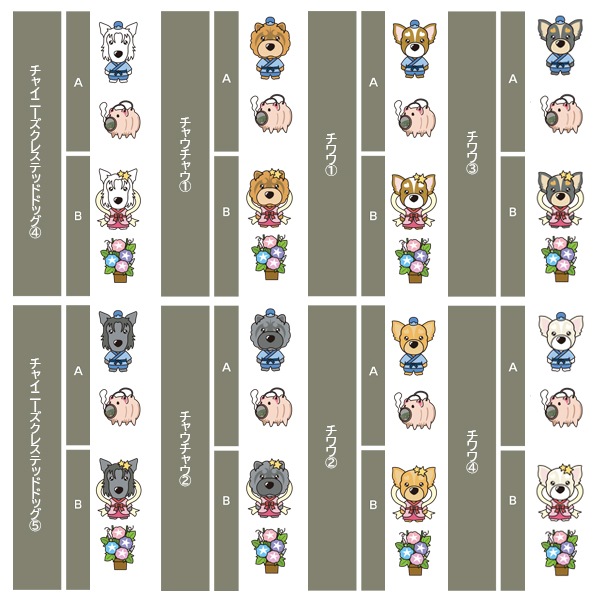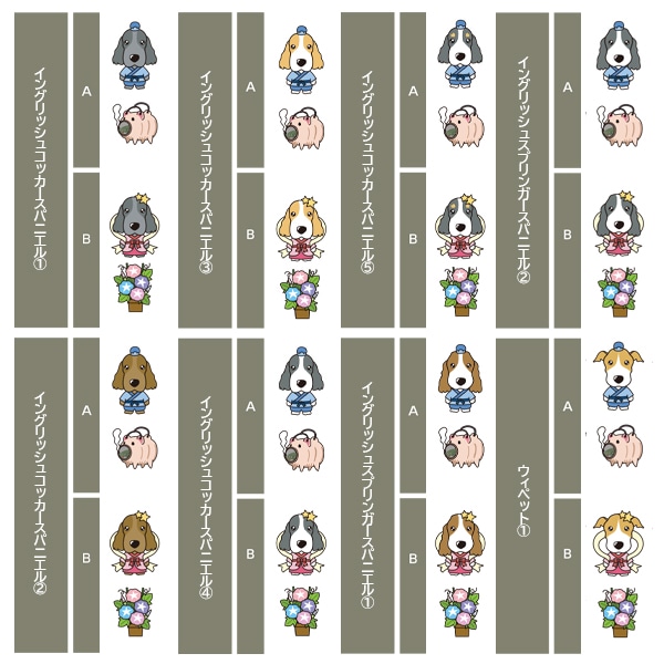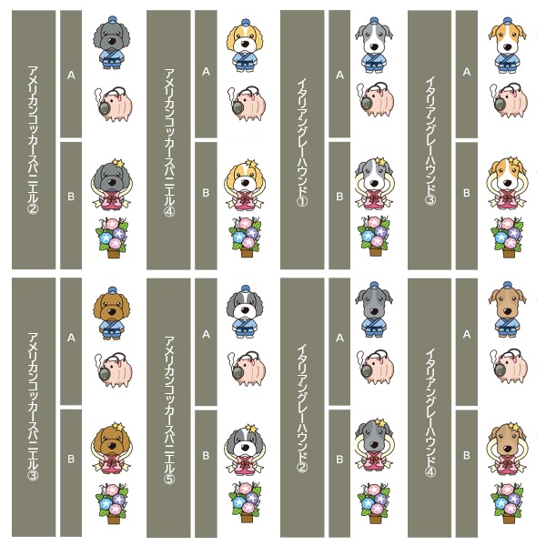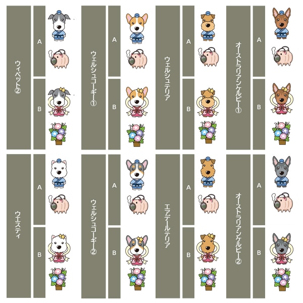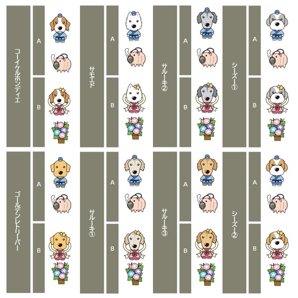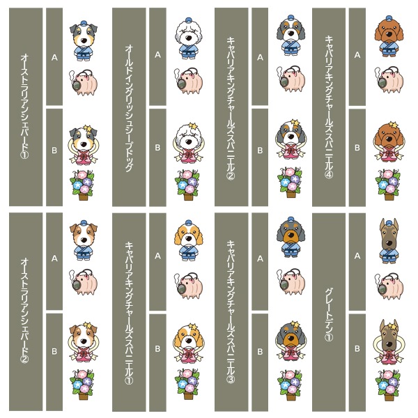 アイリッシュセター、秋田、アフガンハウンド、アメコカ、イタリアングレーハウンド、イングリッシュコッカースパニエル、イングリッシュスプリンガースパニエル、ウィペット、ウエスティ、ウェルシュコーギー、ウェルシュテリア、エアデールテリア、オーストラリアンケルピー、オーストラリナンシェパード、オールドイングリッシュシープドッグ、キャバリア、グレートデン、グレートピレニーズ、ケアーンテリア、コーイケルホンディエ、ゴールデンレトリーバー、サモエド、サルーキ、シーズー、柴、シェットランドシープドッグ、シベリアンハスキー、シーリハムテリア、ジャックラッセルテリア、ジャーマンシェパードドッグ、シュナウザー、スキッパーキ、スコティッシュテリア、スピッツ、ダックスフンド、ダルメシアン、チャイニーズクレステッドドッグ、チャウチャウ、チワワ、狆、トイマンチェスターテリア