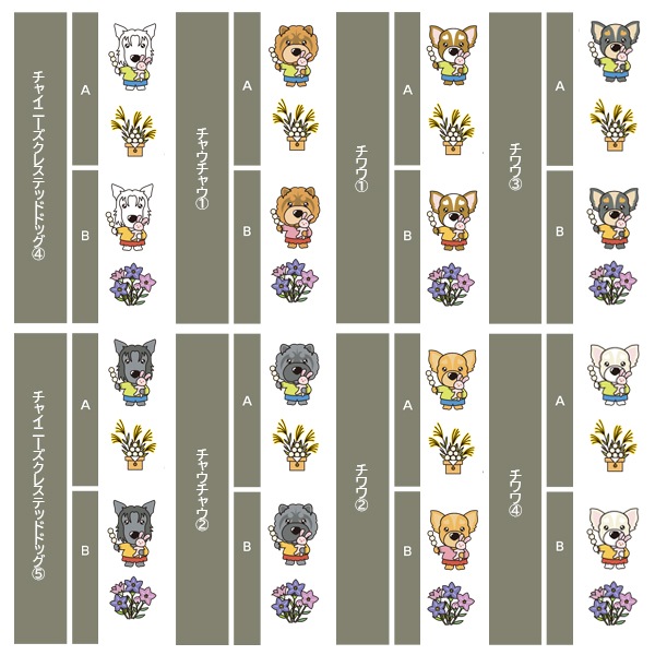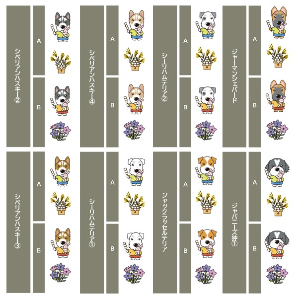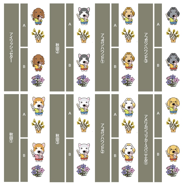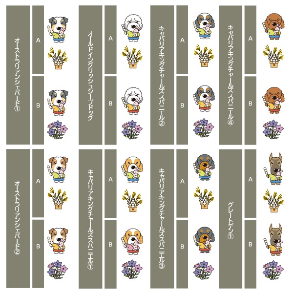 アイリッシュセター、秋田、アフガンハウンド、アメコカ、イタリアングレーハウンド、イングリッシュコッカースパニエル、イングリッシュスプリンガースパニエル、ウィペット、ウエスティ、ウェルシュコーギー、ウェルシュテリア、エアデールテリア、オーストラリアンケルピー、オーストラリナンシェパード、オールドイングリッシュシープドッグ、キャバリア、グレートデン、グレートピレニーズ、ケアーンテリア、コーイケルホンディエ、ゴールデンレトリーバー、サモエド、サルーキ、シーズー、柴、シェットランドシープドッグ、シベリアンハスキー、シーリハムテリア、ジャックラッセルテリア、ジャーマンシェパードドッグ、シュナウザー、スキッパーキ、スコティッシュテリア、スピッツ、ダックスフンド、ダルメシアン、チャイニーズクレステッドドッグ、チャウチャウ、チワワ、狆、トイマンチェスターテリア
