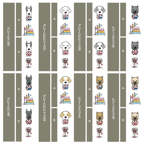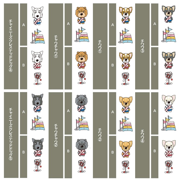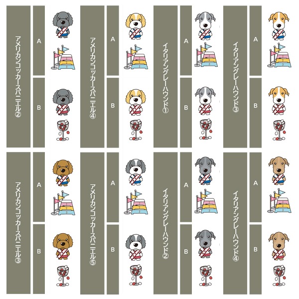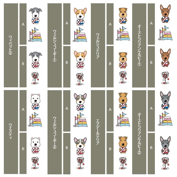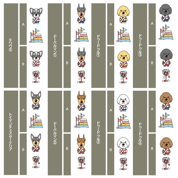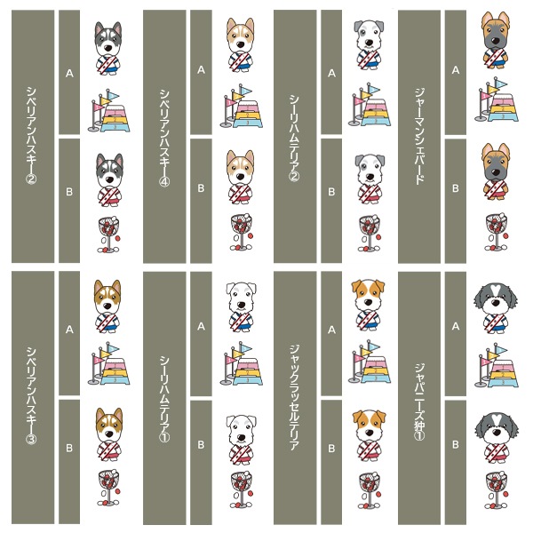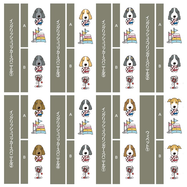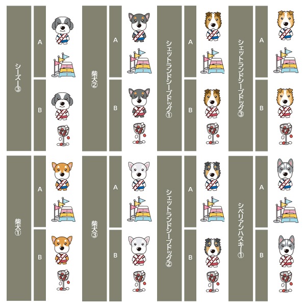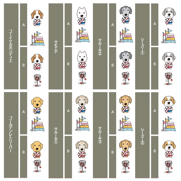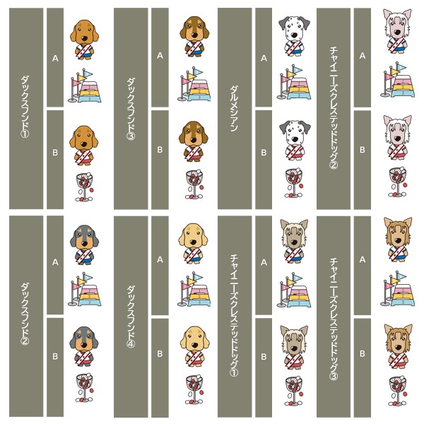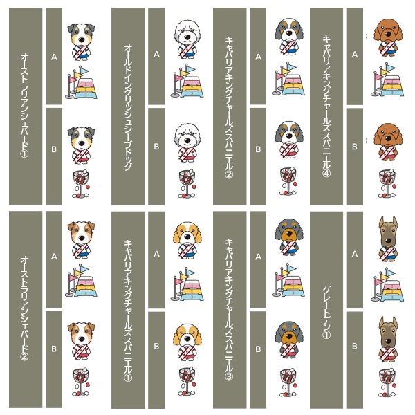 アイリッシュセター、秋田、アフガンハウンド、アメコカ、イタリアングレーハウンド、イングリッシュコッカースパニエル、イングリッシュスプリンガースパニエル、ウィペット、ウエスティ、ウェルシュコーギー、ウェルシュテリア、エアデールテリア、オーストラリアンケルピー、オーストラリナンシェパード、オールドイングリッシュシープドッグ、キャバリア、グレートデン、グレートピレニーズ、ケアーンテリア、コーイケルホンディエ、ゴールデンレトリーバー、サモエド、サルーキ、シーズー、柴、シェットランドシープドッグ、シベリアンハスキー、シーリハムテリア、ジャックラッセルテリア、ジャーマンシェパードドッグ、シュナウザー、スキッパーキ、スコティッシュテリア、スピッツ、ダックスフンド、ダルメシアン、チャイニーズクレステッドドッグ、チャウチャウ、チワワ、狆、トイマンチェスターテリア