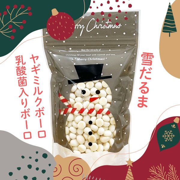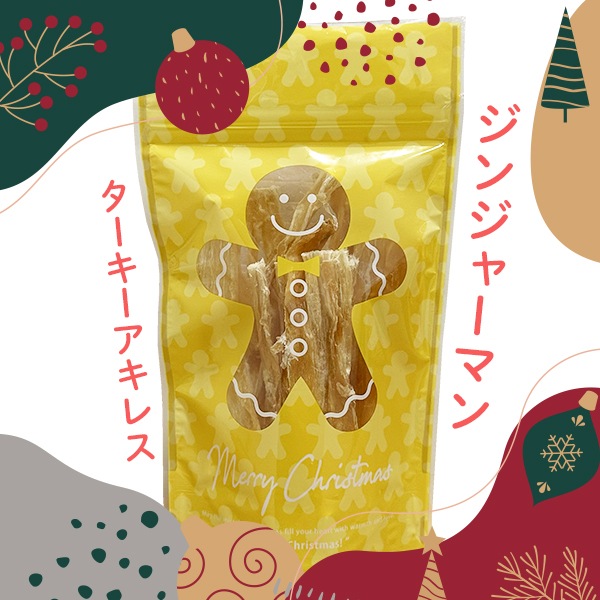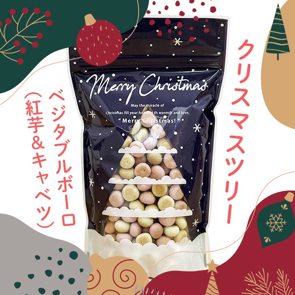 | 原材料 | サンタ(チーズスティック):プロセスチーズ トナカイ(鹿肉チップ):鹿肉 雪だるま(ヤギミルクボーロ):馬鈴薯澱粉、砂糖、麦芽糖、豆乳、ワキシーコーンスターチ、ヤギミルク、食用植物油脂、乳化剤、ビタミンD3、葉酸、香料 雪だるま(乳酸菌入りボーロ):馬鈴薯澱粉、砂糖、鶏卵、ブドウ糖、水あめ、脱脂粉乳、寒梅粉ミックス(とうもろこし・でん粉・もち米)、殺菌乳酸菌粉末、卵殻カルシウム クリスマスツリー(ベジタブルボーロ紅芋):馬鈴薯澱粉、砂糖、卵、粉ミルク、香料、クチナシ色素、紫いも クリスマスツリー(ベジタブルボーロキャベツ):馬鈴薯澱粉、蜂蜜、キャベツ、卵、ほうれん草、野菜MIXペースト(カボチャ、人参、キャベツ、ほうれん草、ターメリック) ジンジャーマン(ターキーアキレス):七面鳥 |